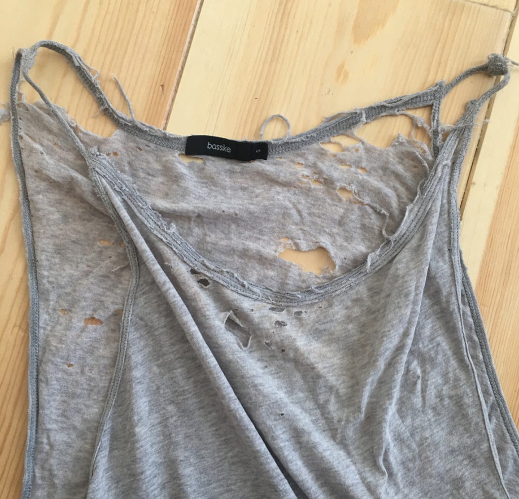 I wear things out. Then I replace that thing. My good shirt will become my hiking shirt after about six months of constant wear. Replacing the hiking shirt that has also worn out. Things get bumped down the line and we keep things neatly “net”. Above is a singlet I wore most days for about four years. I currently have a striped one, exactly the same, that probably has another six months in it.