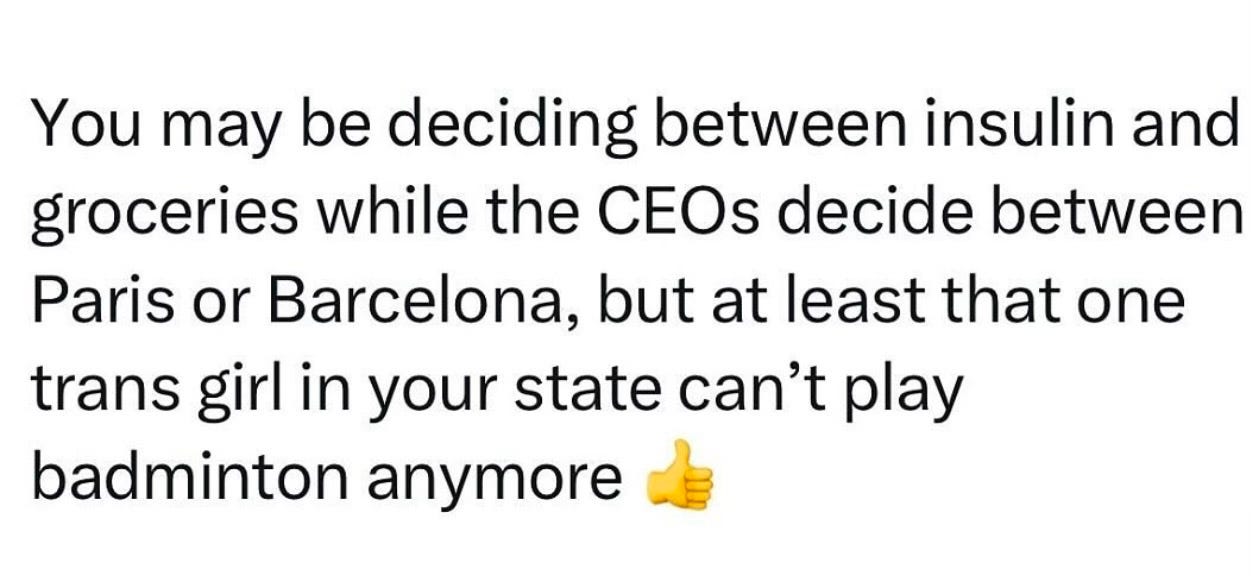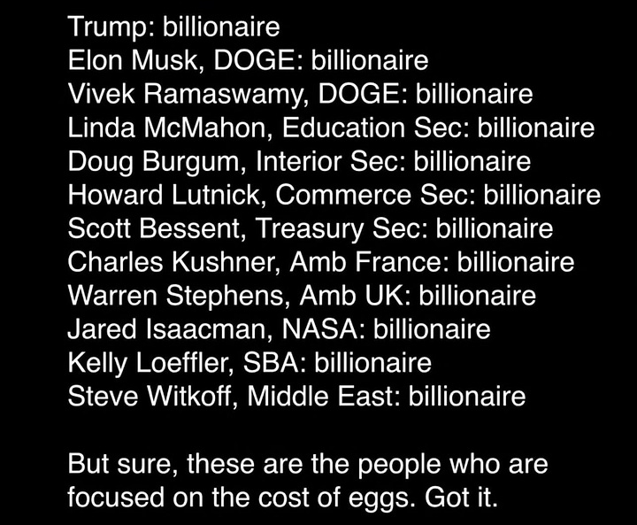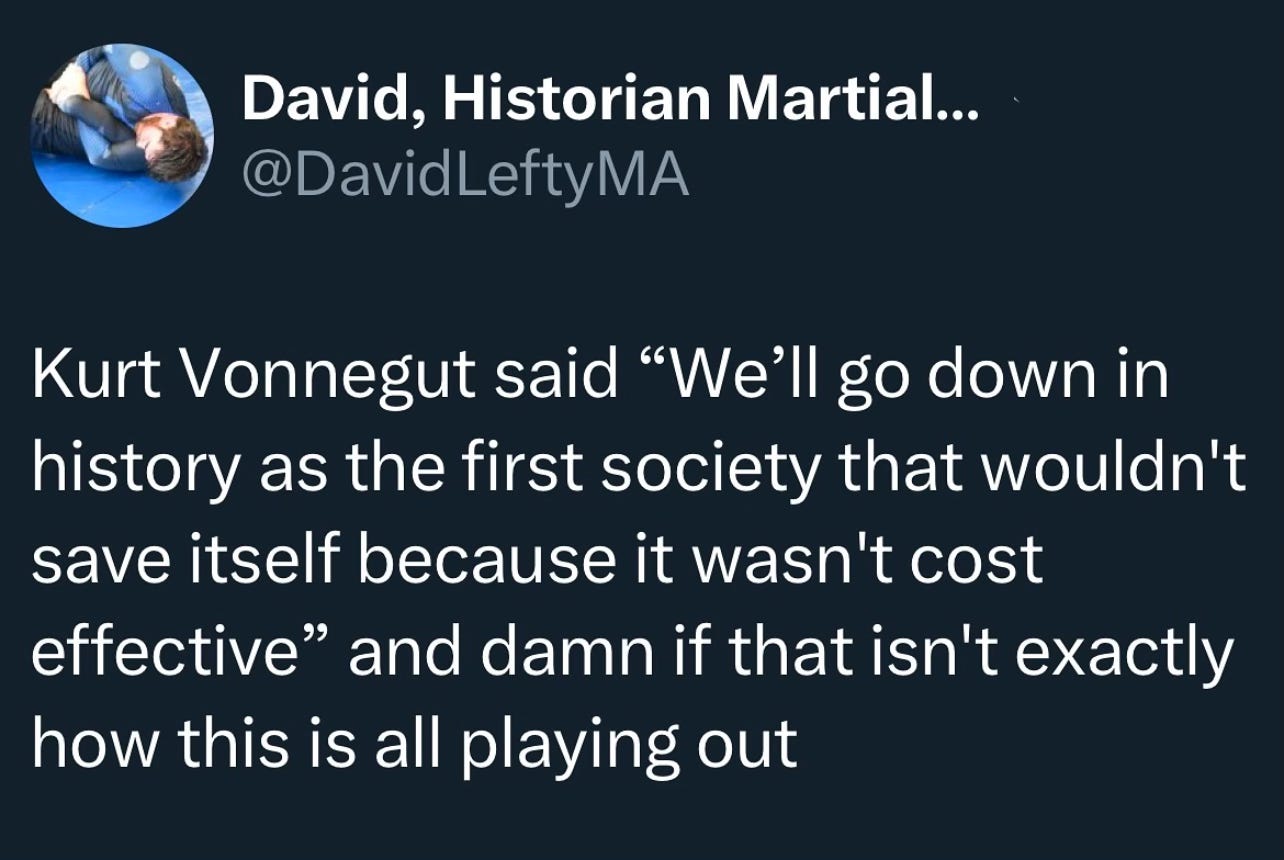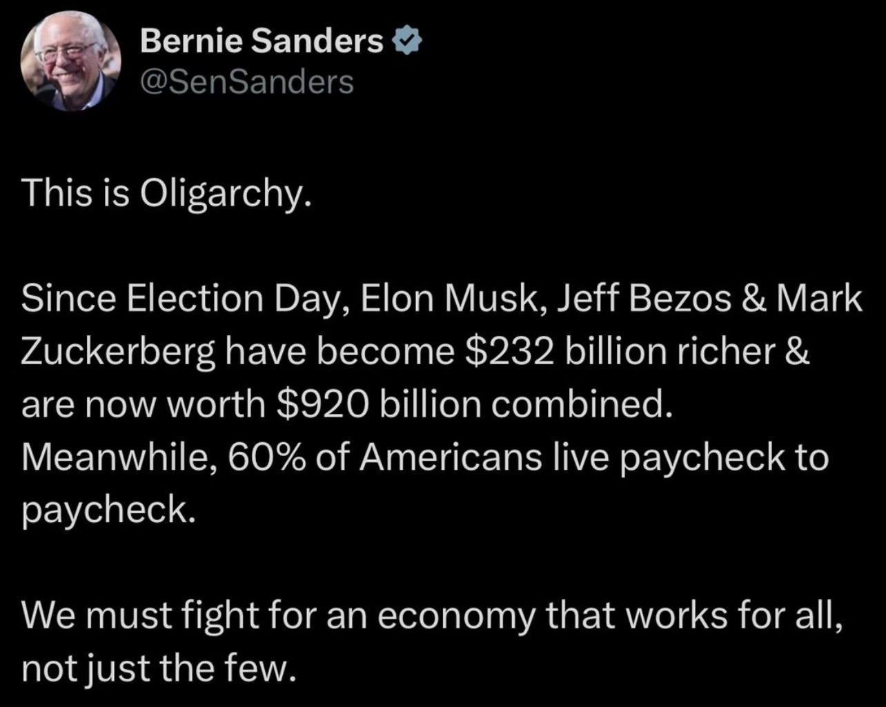 Another observation: the pivot - or pain - point is very clearly wealth inequality and the failure of capitalism. Some tragic climate headlines also poured in over the break, and of course, the “unprecedented” Los Angeles fires have been raging. But what’s bringing collapse to light for the bulk of people is the obscene disparity between a handful of mega-rich, morally stunted tech bros and the rest of the world.