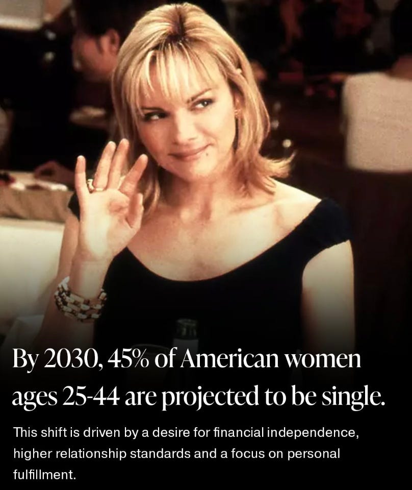 A recent study by Morgan Stanley has predicted that nearly 45% of women will remain single and child-free by 2030, creating the fastest growing cohort in the US. Per the Collapse chapters, the pattern is emulated around much of the developed world.